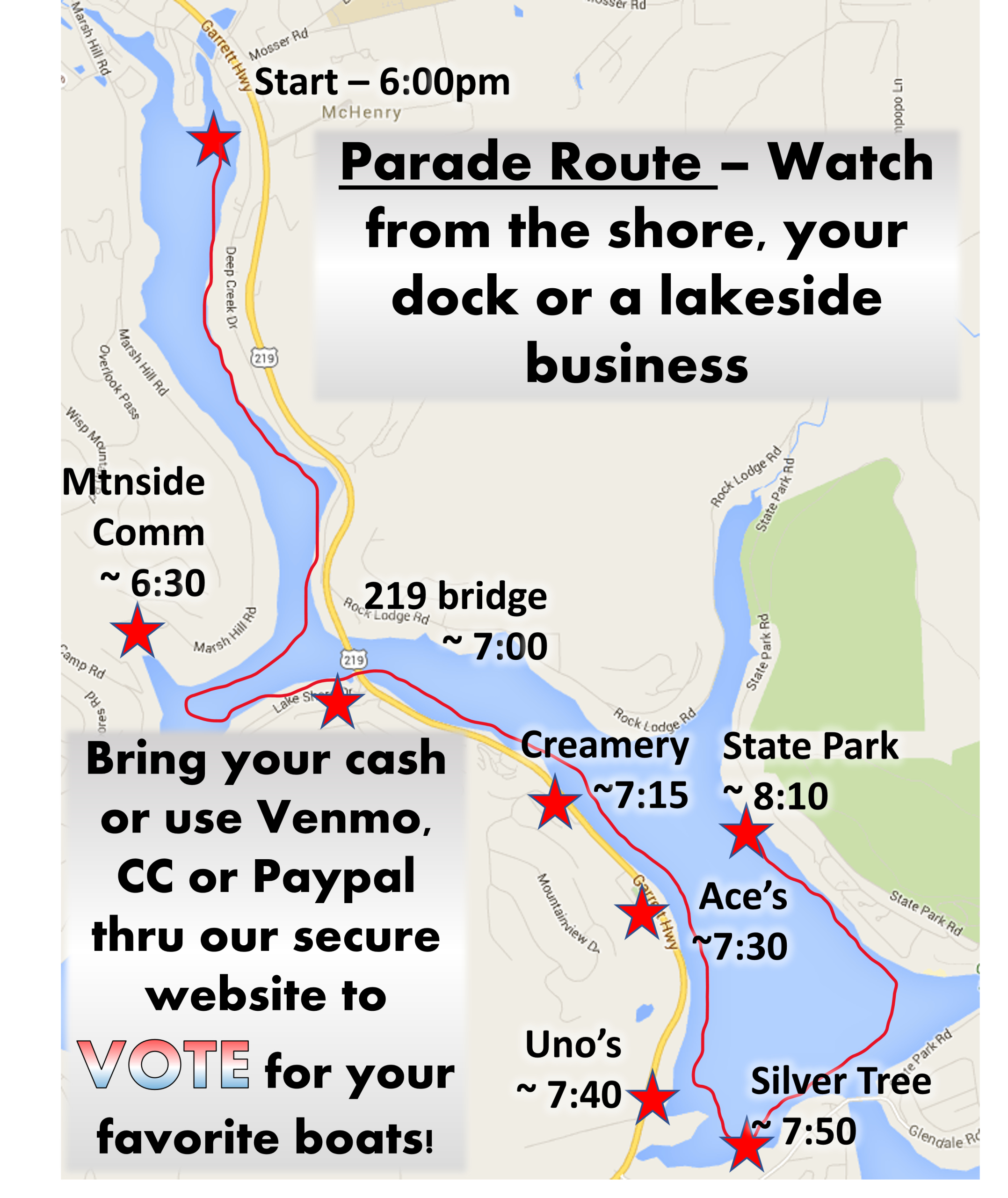 The parade begins at 6PM at the Silver Tree Marine boat launch in McHenry Cove. It proceeds along the parade route ending at Dutch's at Silver Tree. You can watch and vote for your favorite boat!